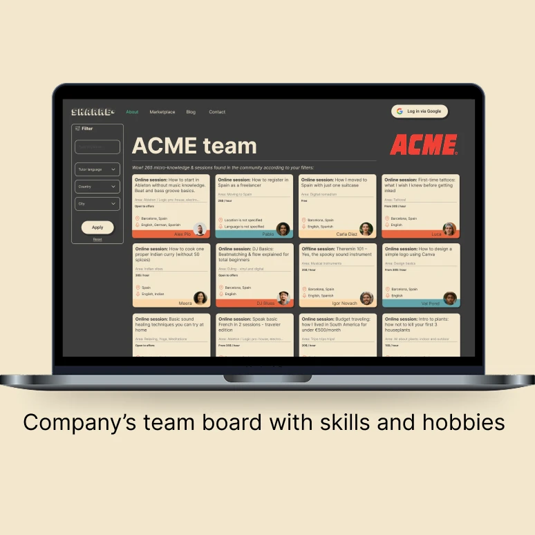 Employees fill profiles with hobbies and micro-knowledge and ready to accept bookings from colleagues